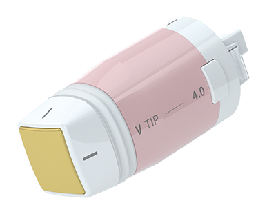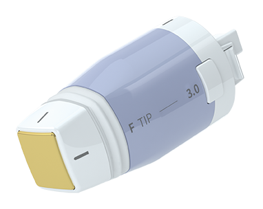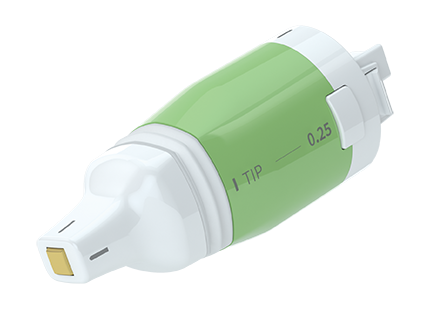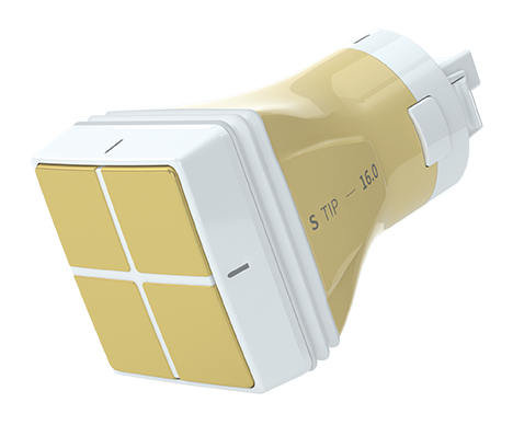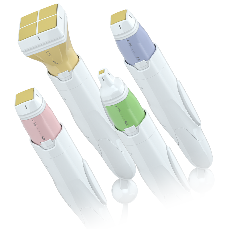 Tips ergonômicas curvas para contato perfeito com a pele, otimizam o fornecimento de energia RF. A geração uniforme de RF em toda a superfície evita efeitos adversos na epiderme.